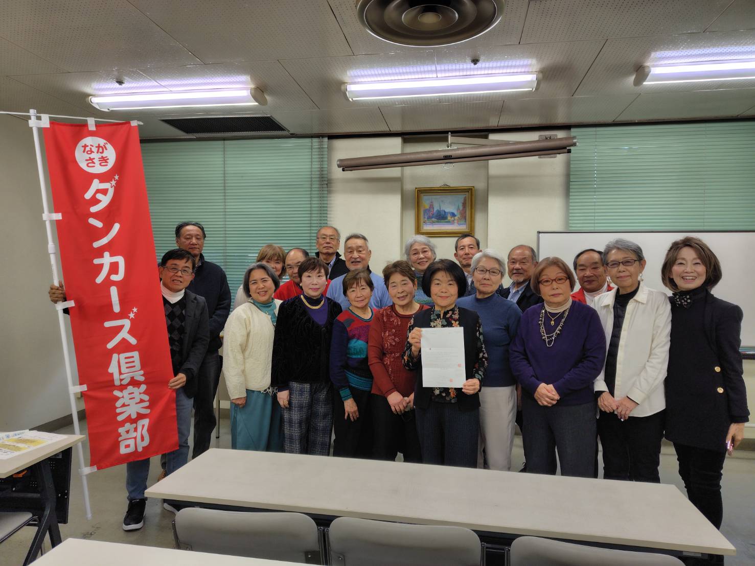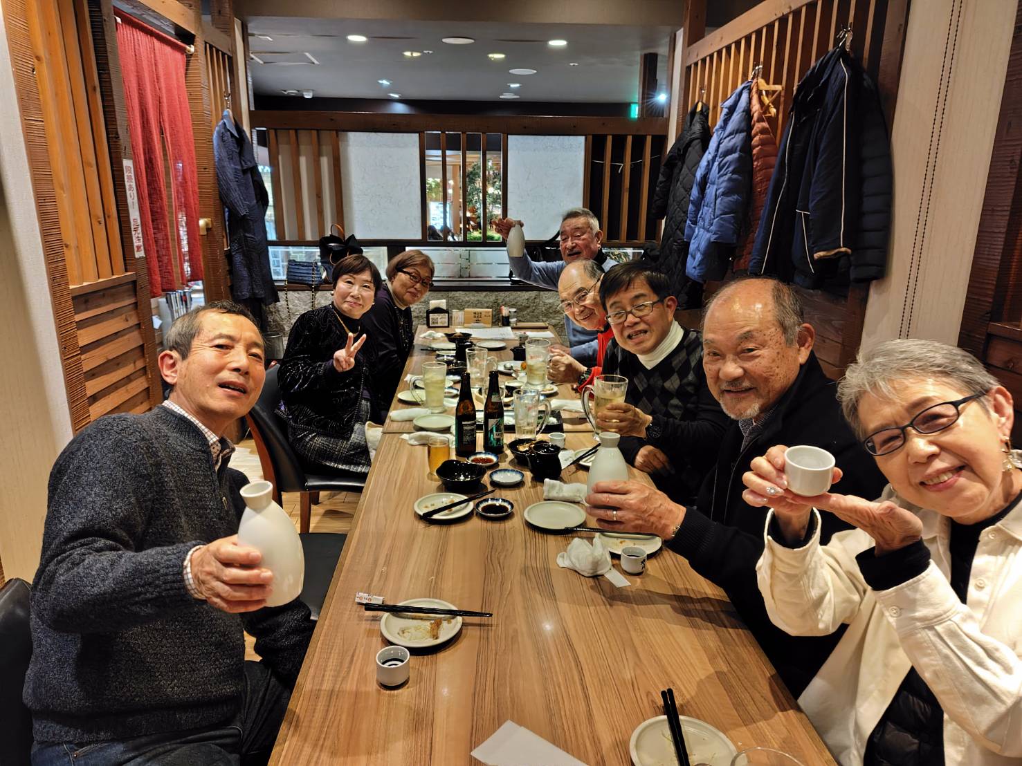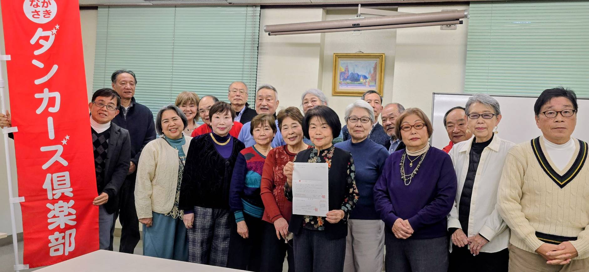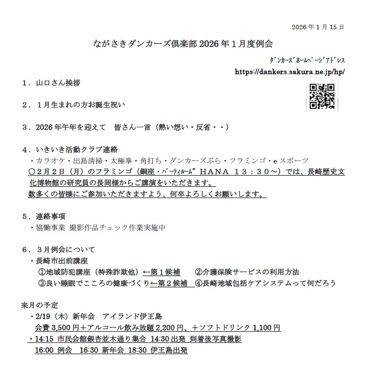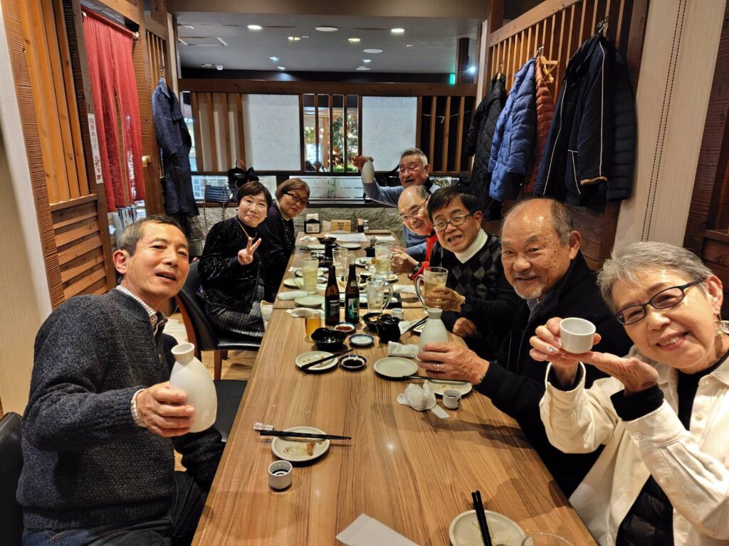 2026年1月第1回例会報告(文責:中村) お知らせ 2026.01.17 〇 2026年1月15日(木)例会は、「新年を迎え皆さん一言」! (16:00~市民会館第4研修室)新人夫妻2名を含め、合計18名の参加でした。 ・例会の終わりに、昨年の”大分市大規模火災緊急支援募金”の日赤からの領収書と一緒に全員で写真を撮りました。これを長崎新聞に届ける予定です。 ・交流会:アミュプラザ4F ”朝次郎”で 9名参加、みんなでワイワイ自由な会話で楽しみました。 新しく参加した御夫妻からのご挨拶!タスマニアに30年暮らしてから帰国。昔住んだことのある、長崎に居住を決めたとのこと。ダンカーズの皆さんと、楽しい生活をしましょうね! 日赤からの領収書を中心にパチリ!長崎新聞に報告する予定です。 交流会は、はじめて、アミュプラザ”朝次郎”で!おいしいお酒と楽しい会話で、ほろ酔い!?(撮影して頂いた、Kさんが写ってません・・・ごめんなさい。) 202601月例会アジェンダダウンロード